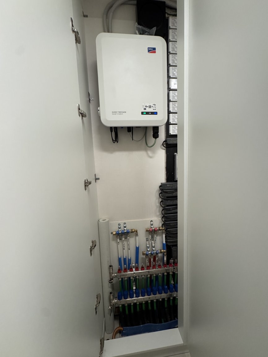 De zonnepanelen werden gekoppeld aan een SMA Tripower 6.0 Smart Energy hybride omvormer. Deze omvormer laat niet alleen toe om opgewekte zonne‑energie optimaal te benutten, maar is ook volledig voorbereid op een latere uitbreiding met batterijopslag. Zo is de installatie klaar voor verdere stappen richting maximale zelfconsumptie en energie‑onafhankelijkheid.