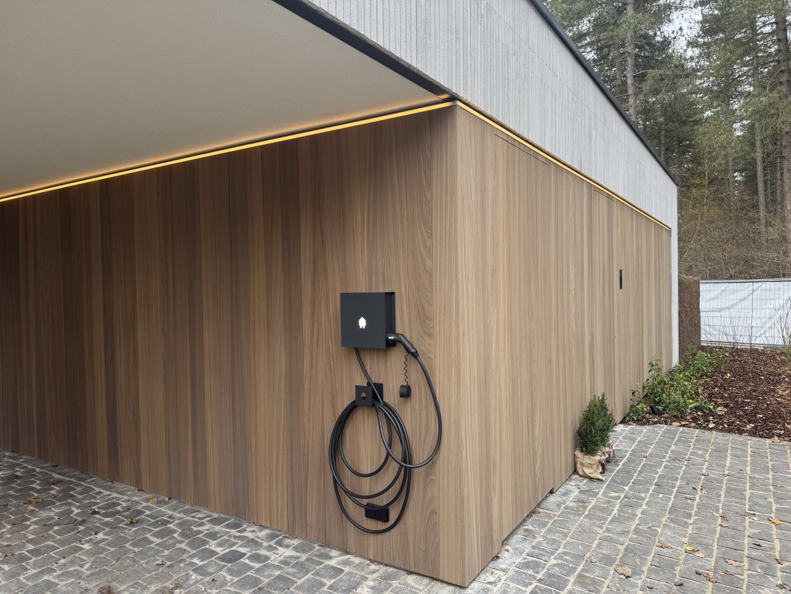 Voor elektrisch laden werd gekozen voor een EV Wall Black van Smappee. Deze laadoplossing combineert een strak design met slimme laadfunctionaliteiten en past perfect binnen het energieconcept van de woning.